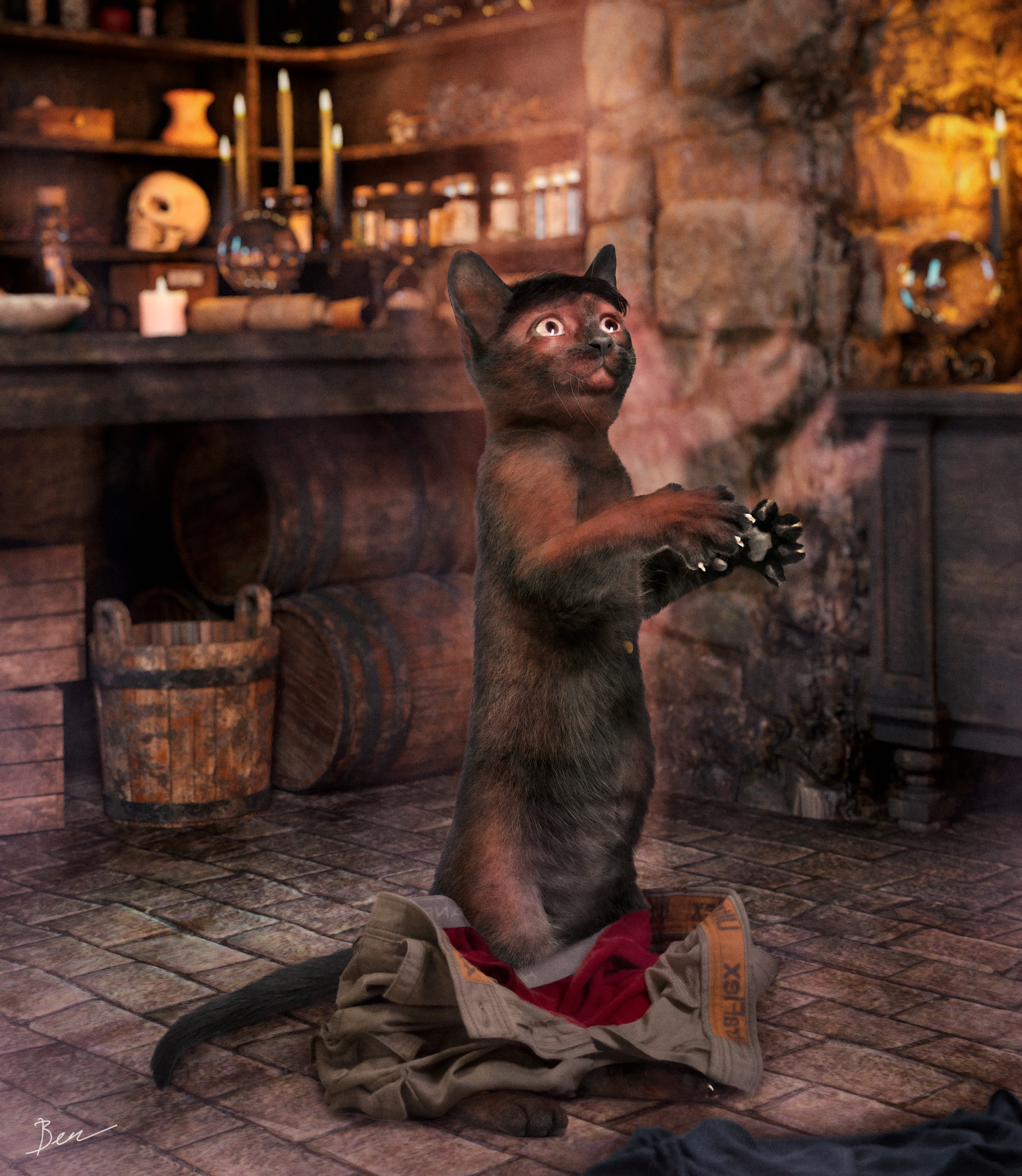 With a gentle smile, the witch leaned down and picked up the small black cat– the feline’s former identity fading with the lingering effects of the spell. She kicked away the clothes on the ground and carried her new pet to a small table where books and papers were strewn about. Time to get back to work!
